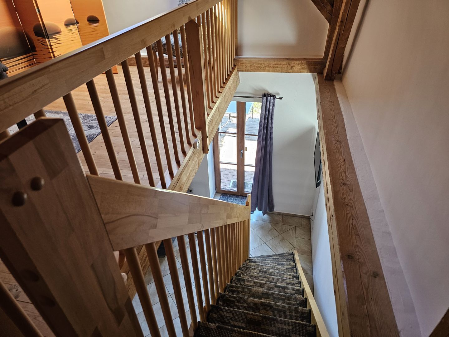 Über eine Holztreppe gelangen Sie nach oben in den gemütlichen Schlafbereich mit großem Bett (180x200), Schlafcouch (120x180), Kleiderschrank, Sideboard und einem 2. Fernseher.
