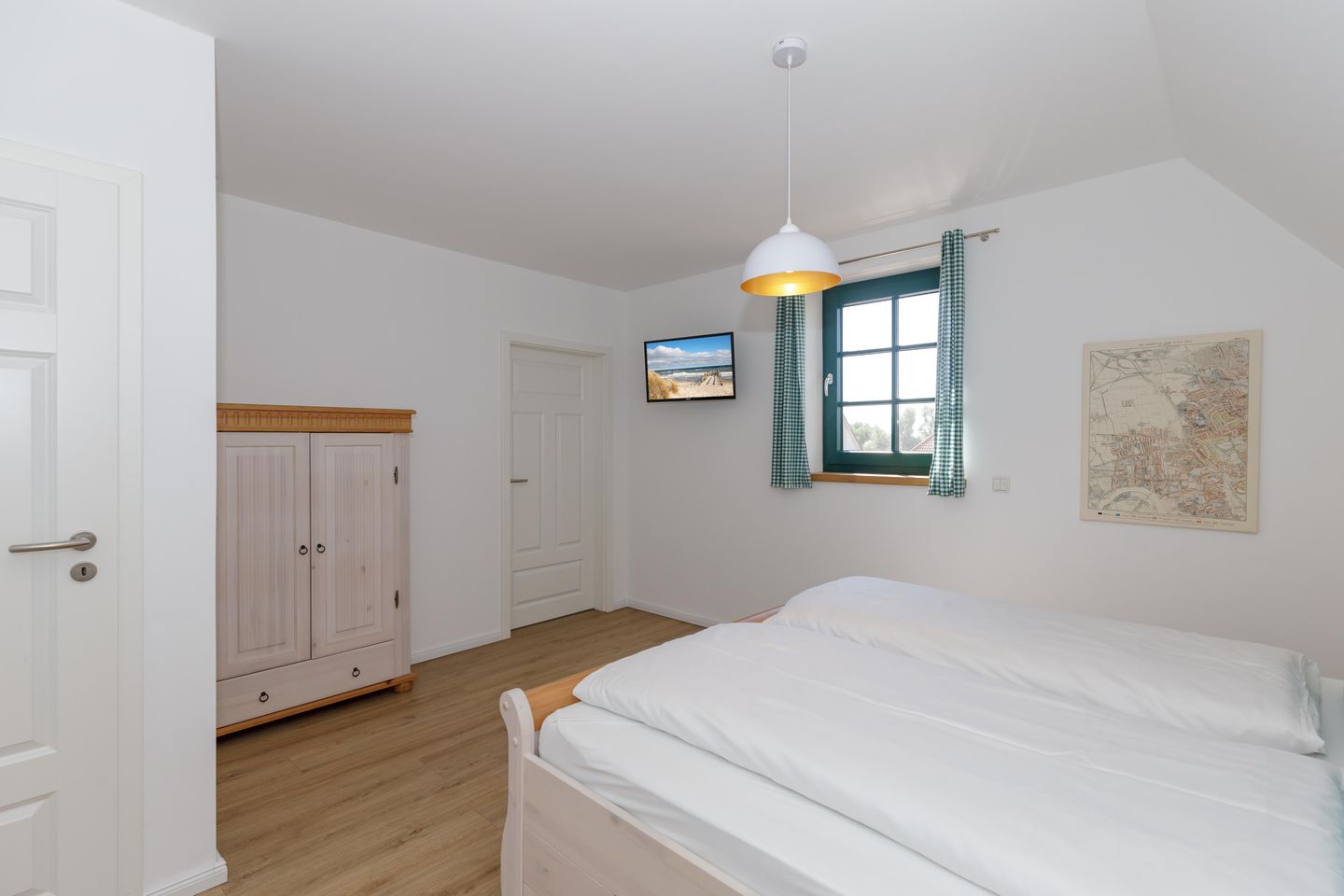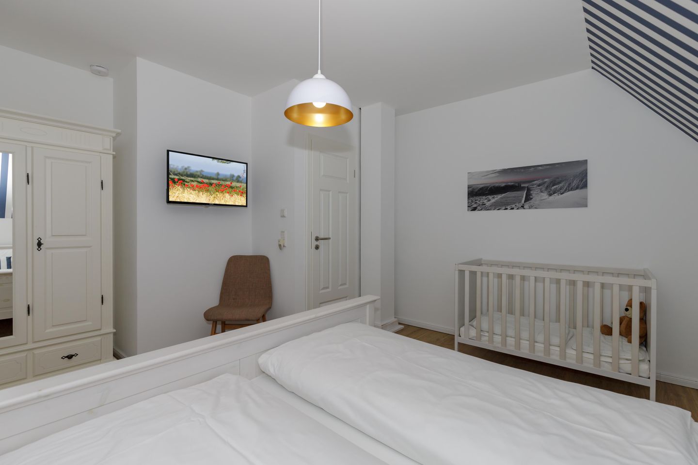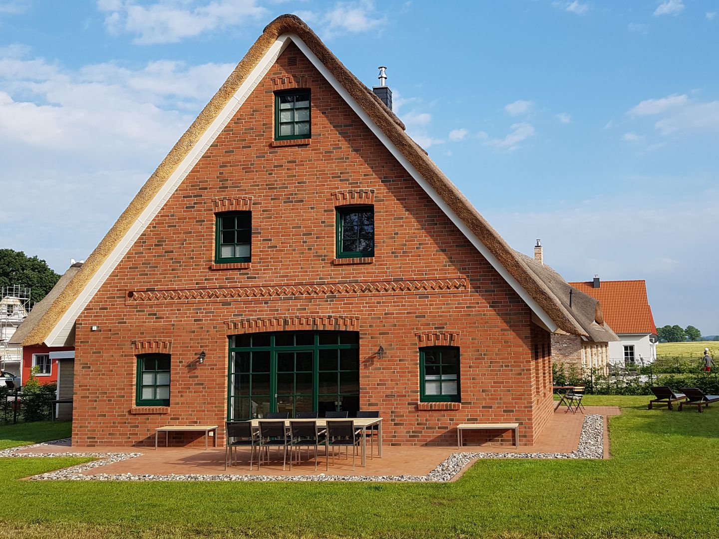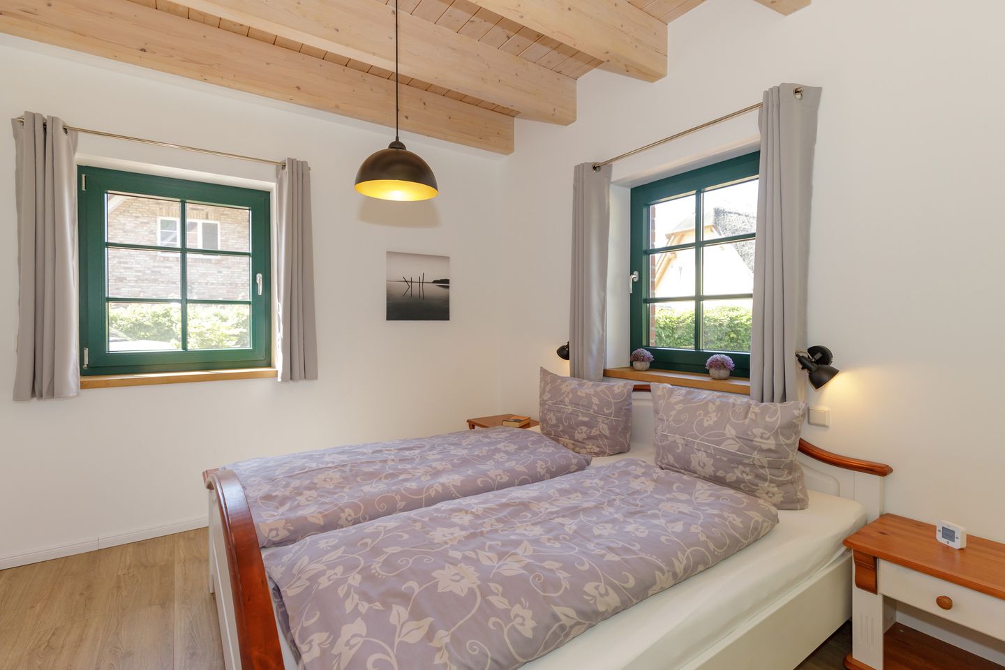 Im Inneren erwarten Sie fünf individuell gestaltete Schlafzimmer. Drei komfortable Badezimmer mit bodengleichen Duschen und eins mit einer Badewanne, bieten genügend Privatsphäre für alle Gäste. Ein separates Gäste-WC im Erdgeschoss sorgt für zusätzlichen Komfort. Die Fußbodenheizung im gesamten Haus sowie Fliesenböden im Wohnzimmer schaffen ein angenehmes Raumklima zu jeder Jahreszeit.