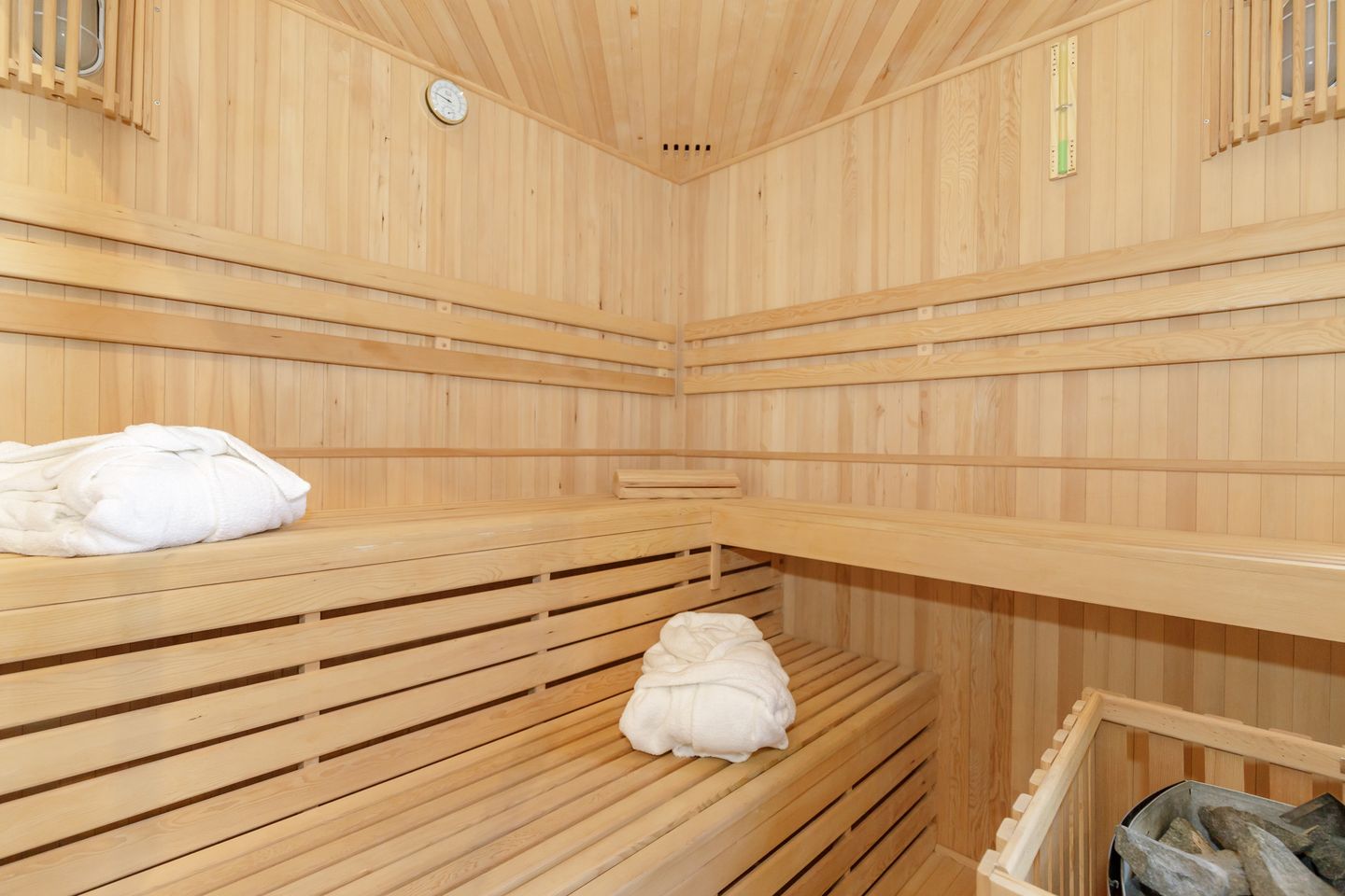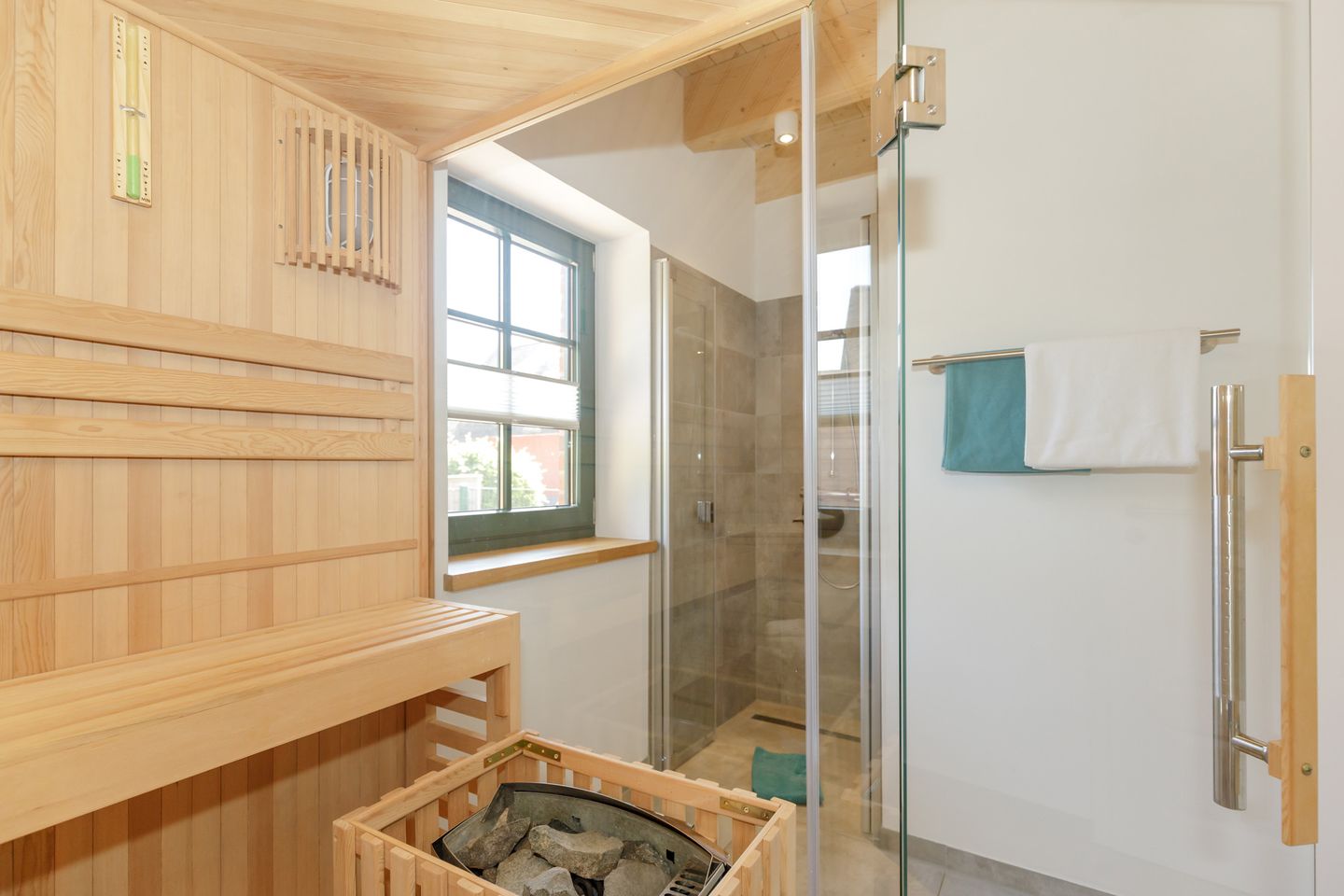 Für Wohlfühlmomente sorgt die hauseigene Sauna, die Ihnen zur exklusiven Eigennutzung zur Verfügung steht und besonders nach einem Tag am Strand Entspannung bietet. An den Fenstern sind Insektenschutzgitter angebracht, und Sichtschutz für jede Fensterfläche gewährleistet ungestörte Privatsphäre.