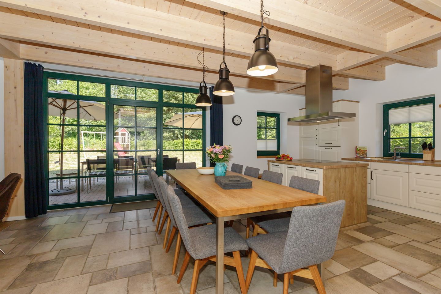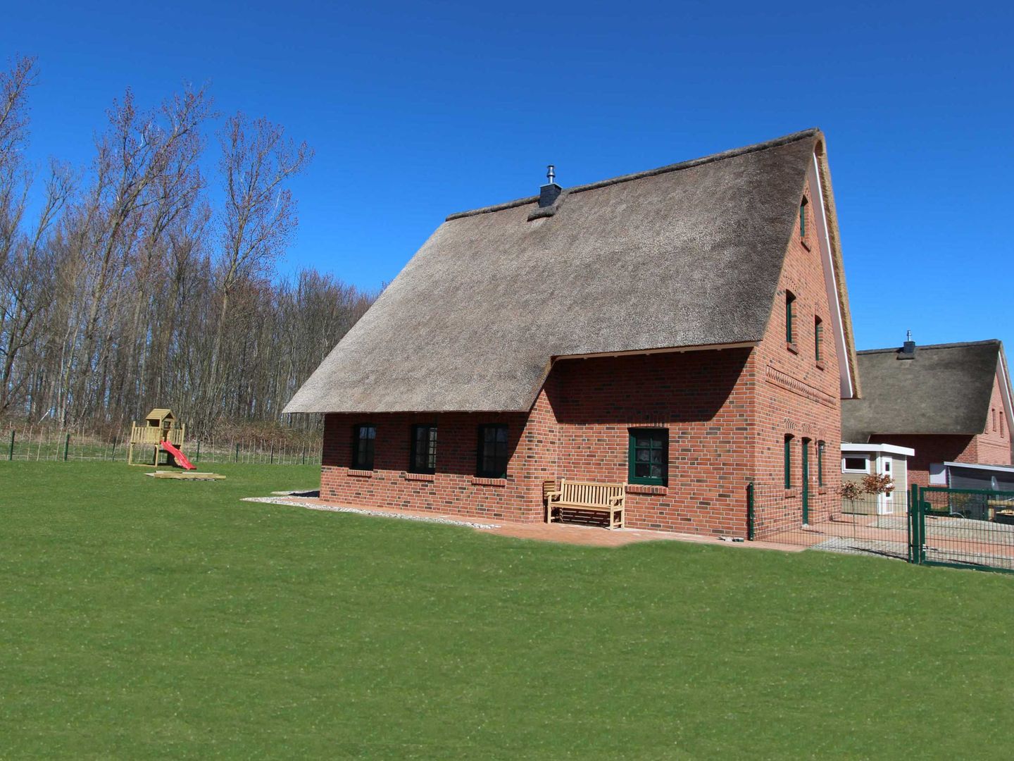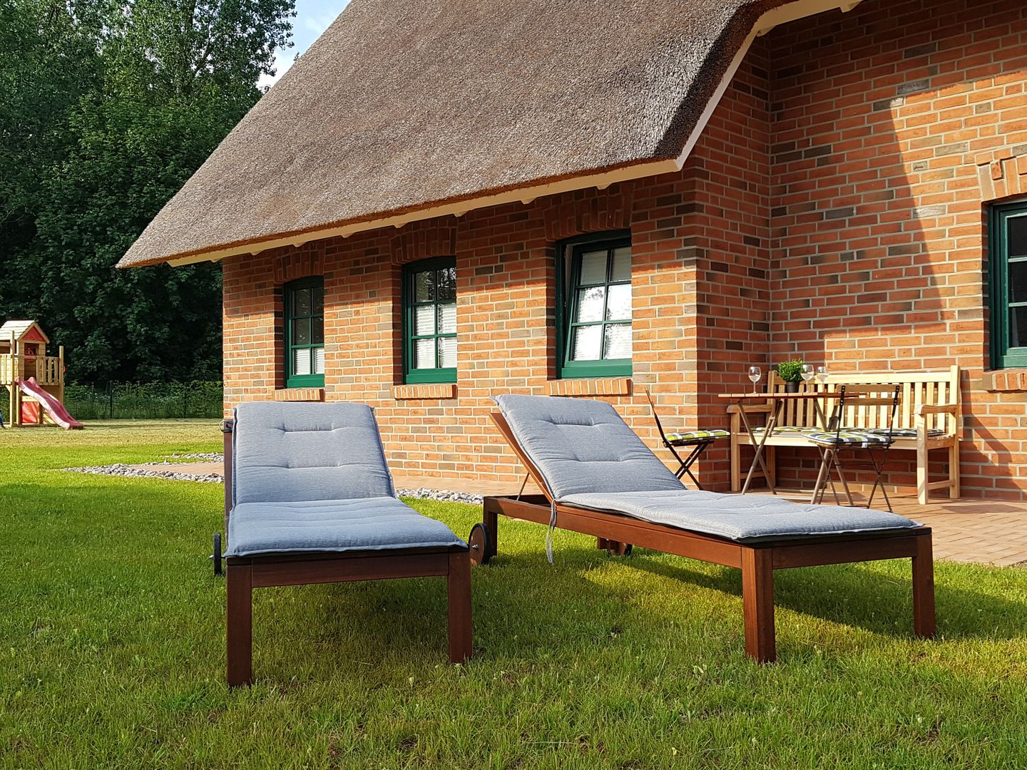 Der gepflegte Garten beeindruckt mit Liegewiese, Sonnenliegen, Gartenmöbeln und einem abgeschlossenen Grundstück – ideal für Familien mit Kindern oder Hundebesitzer (bis zu zwei Hunde erlaubt). Kinder finden hier zahlreiche Spielmöglichkeiten wie Rutsche, Schaukel und eine große Wiese. Eine Terrasse mit Sonnenschirm, Kohlegrill und Gartenblick lädt zu geselligen Abenden im Freien ein. Für Fahrzeuge stehen vier Privatparkplätze auf dem Grundstück zur Verfügung.