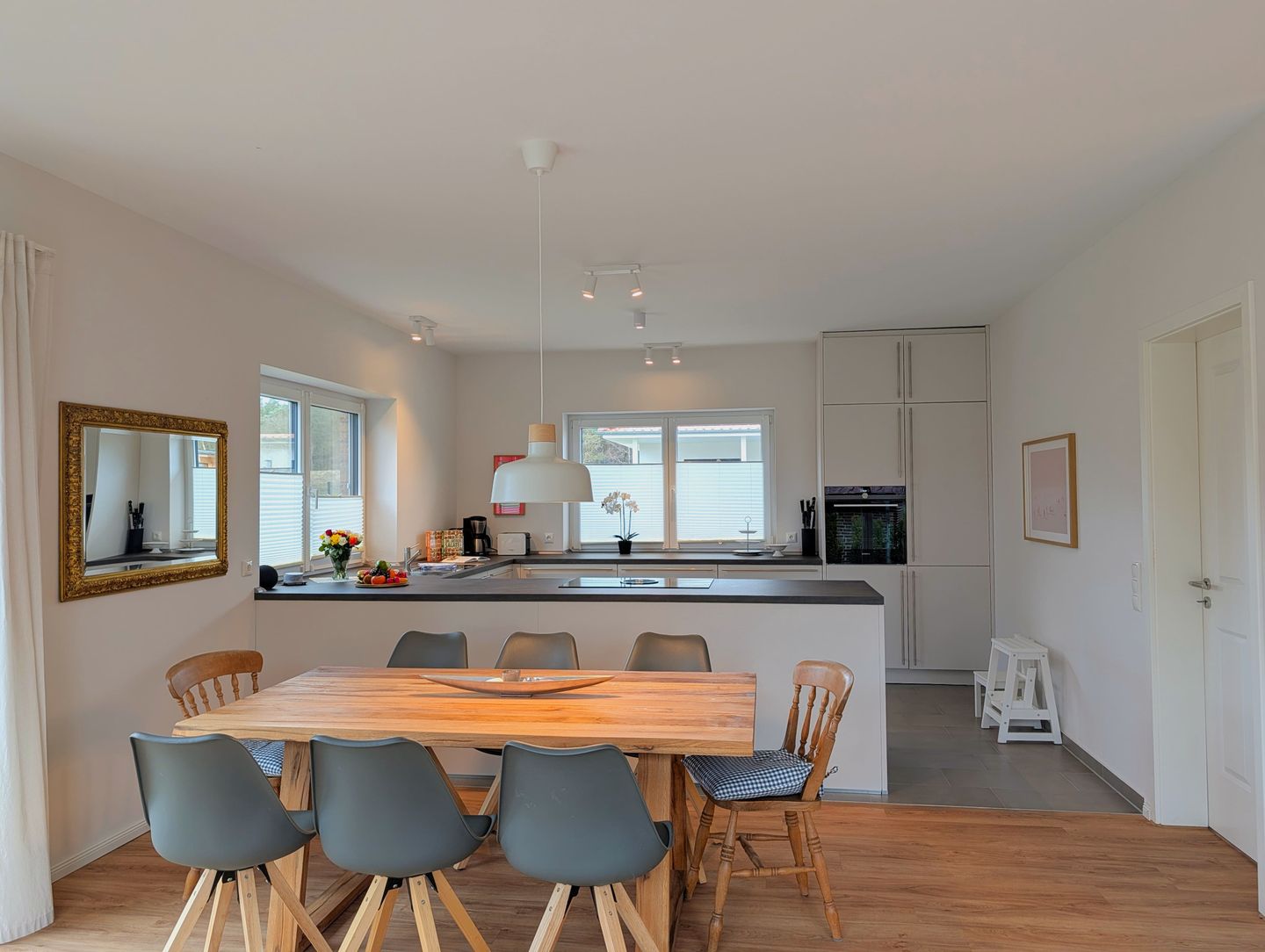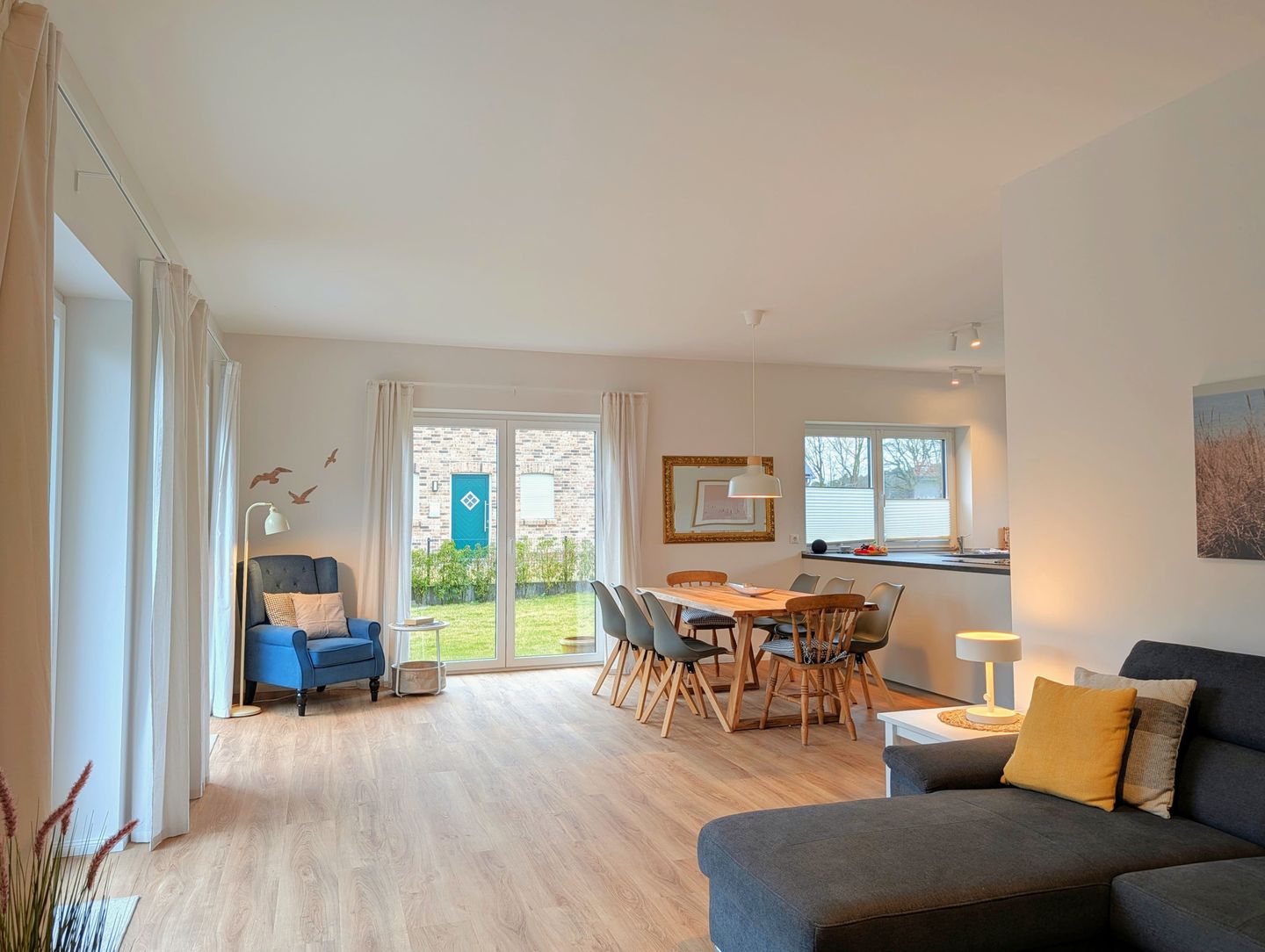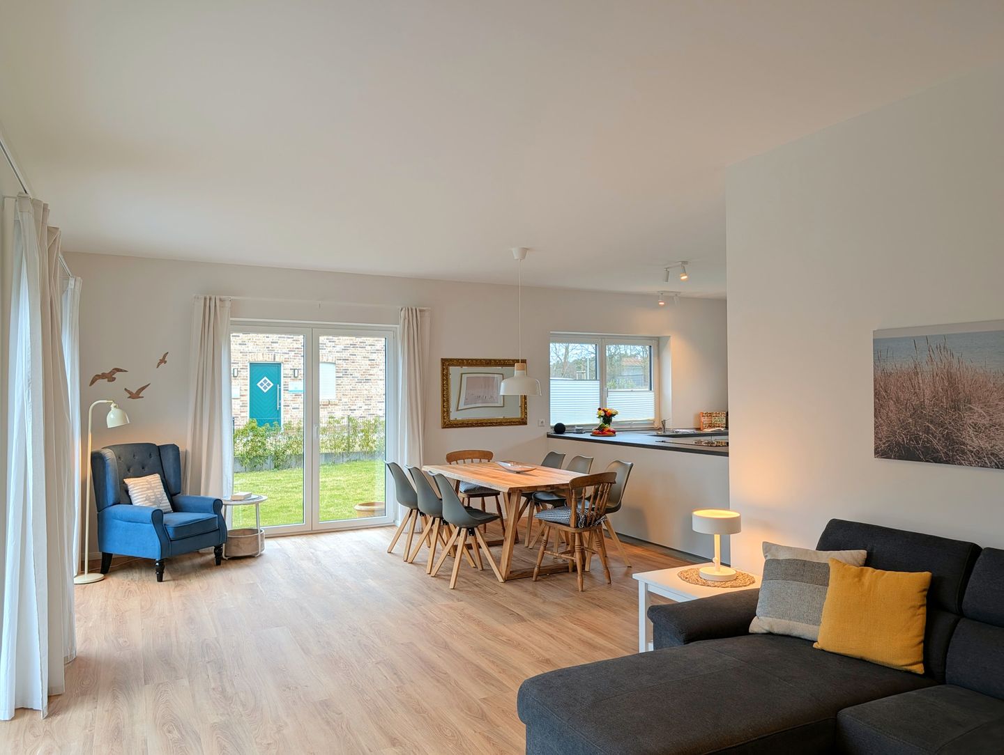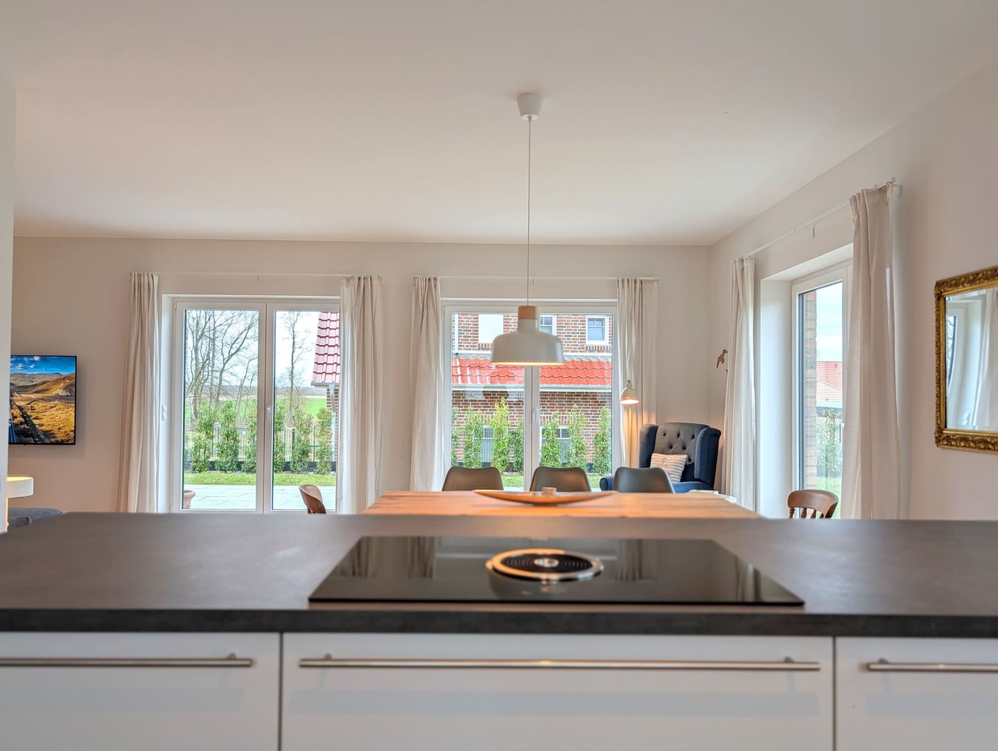 Der offene, gemütliche Wohnbereich lädt zum gemeinsamen Verweilen ein: Eine kuschelige Sofaecke, ein bequemer Sessel, ein großer Esstisch an dem alle zusammen kommen und die offene Küche schaffen viel Platz für Familienmomente und gemütliche Abende mit Freunden. Für Unterhaltung sorgen 2 Smart-TVs, sanftes Radio, eine bunt gemischte Bücherecke sowie WLAN und eine schnelle Internetverbindung (ab 100 Mbit/s) – damit sich jeder sofort wie zuhause fühlt.