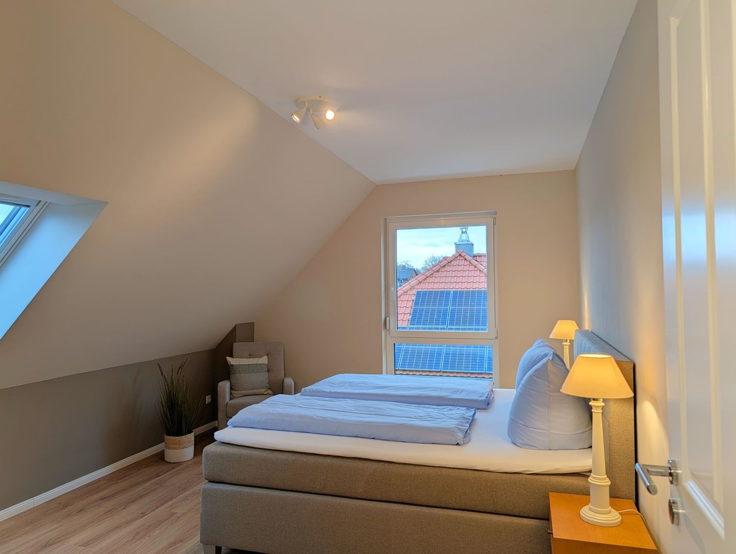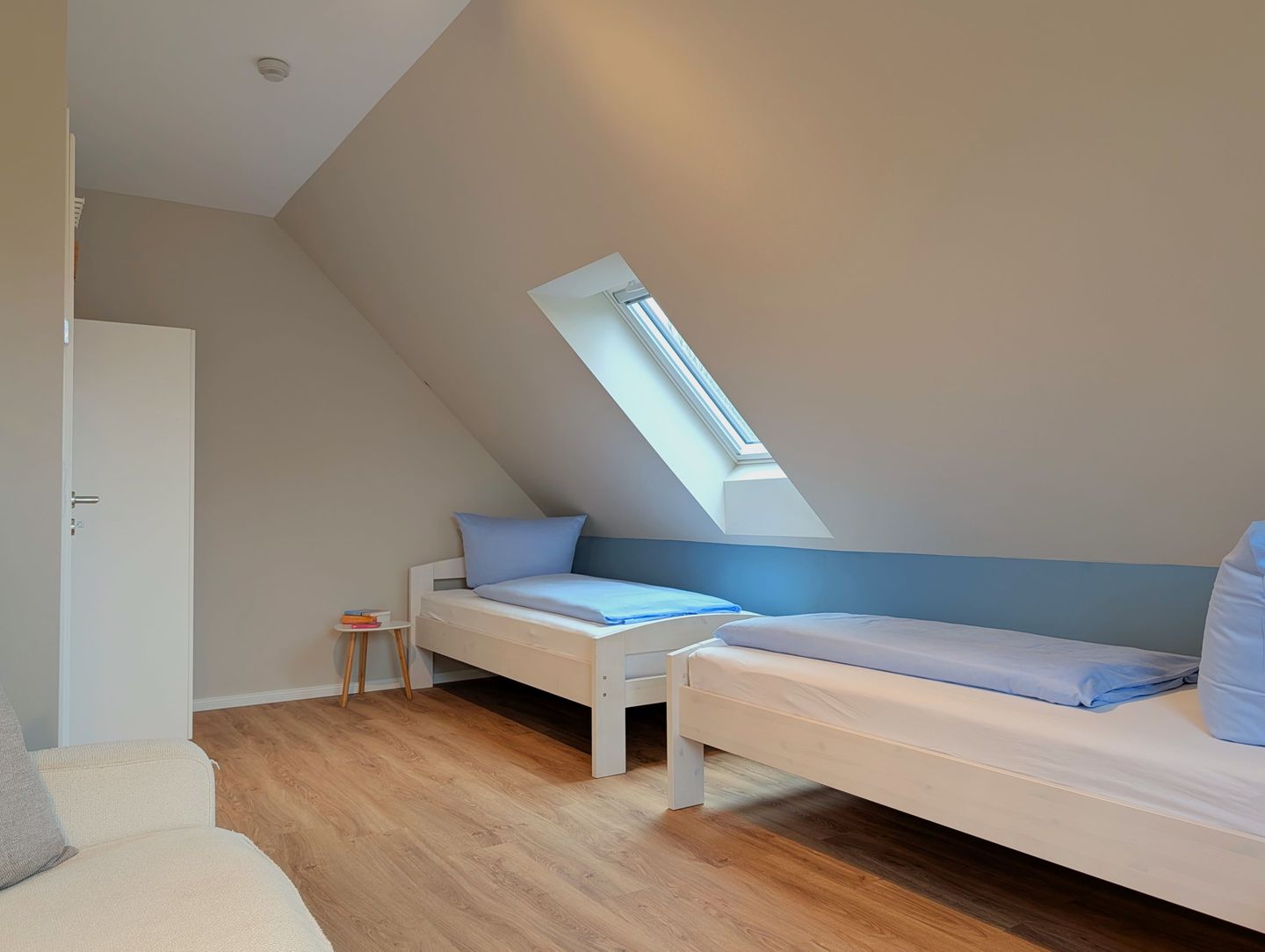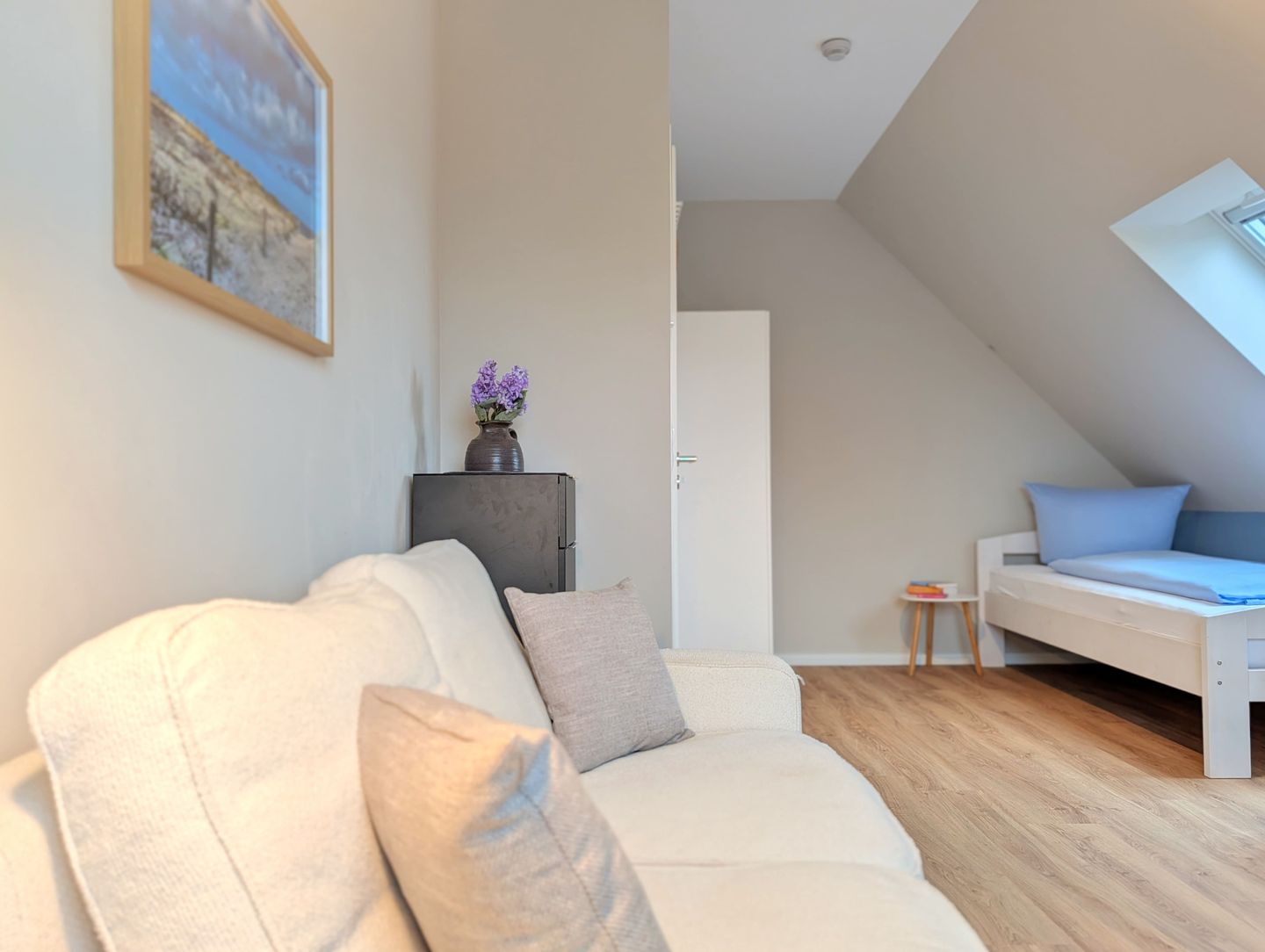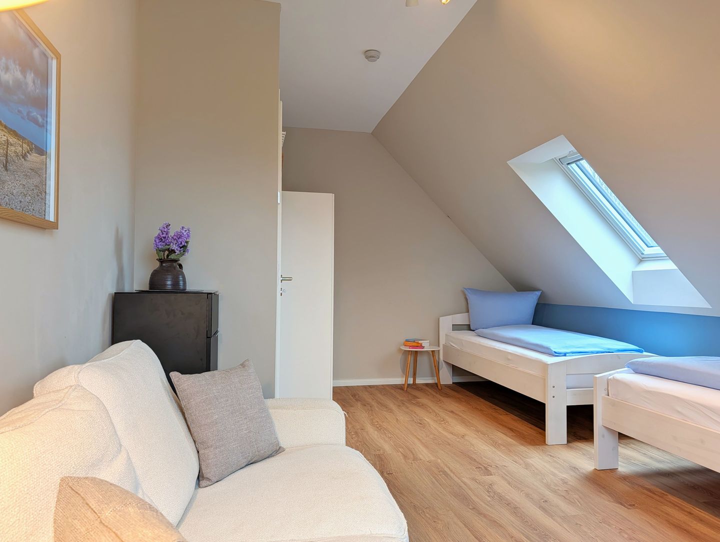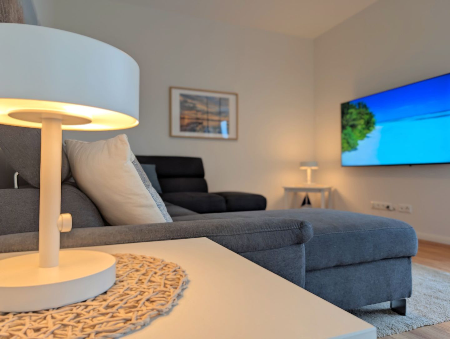 Der offene, gemütliche Wohnbereich lädt zum gemeinsamen Verweilen ein: Eine kuschelige Sofaecke, ein bequemer Sessel, ein großer Esstisch an dem alle zusammen kommen und die offene Küche schaffen viel Platz für Familienmomente und gemütliche Abende mit Freunden. Für Unterhaltung sorgen 2 Smart-TVs, sanftes Radio, eine bunt gemischte Bücherecke sowie WLAN und eine schnelle Internetverbindung (ab 100 Mbit/s) – damit sich jeder sofort wie zuhause fühlt.