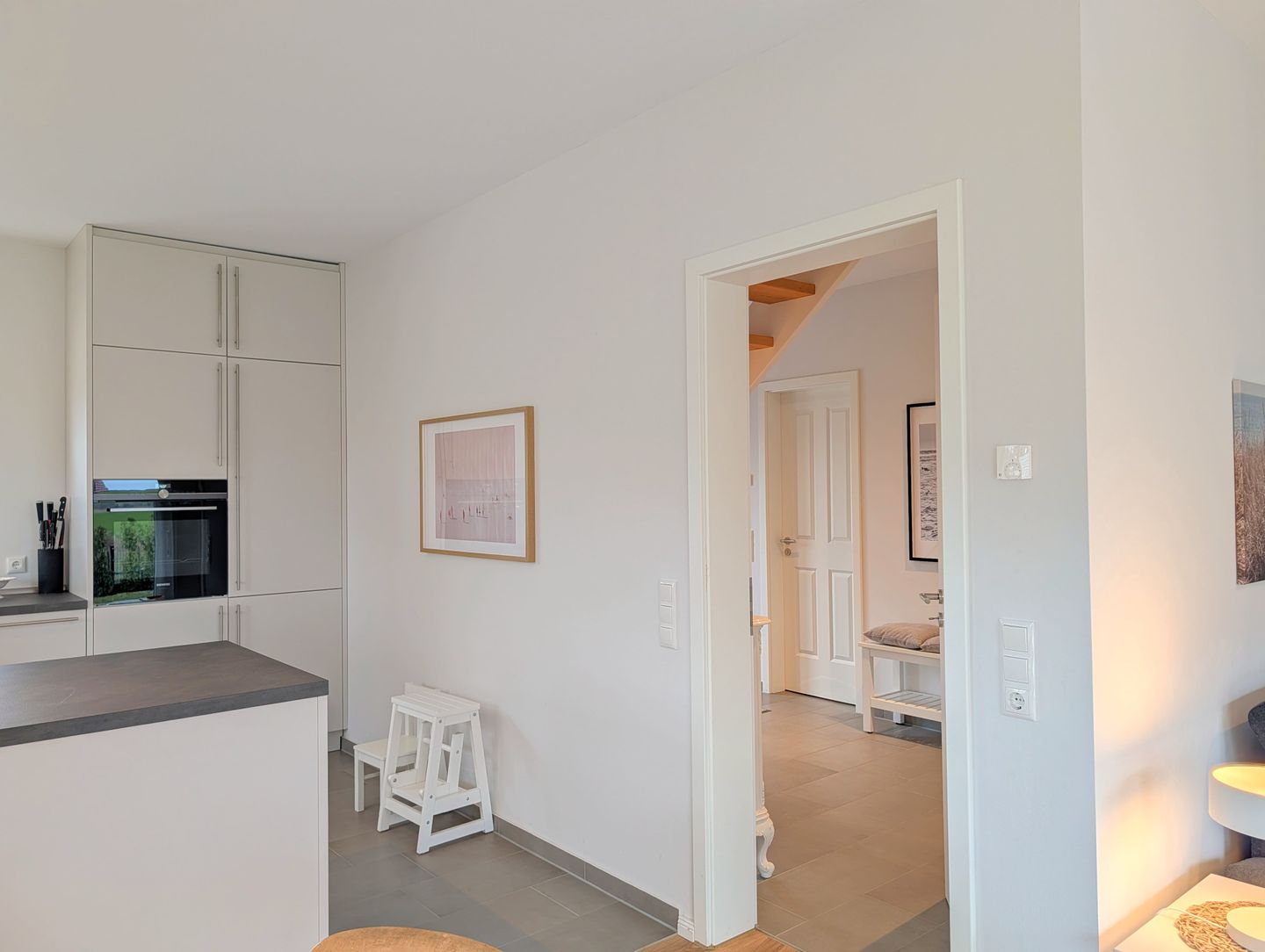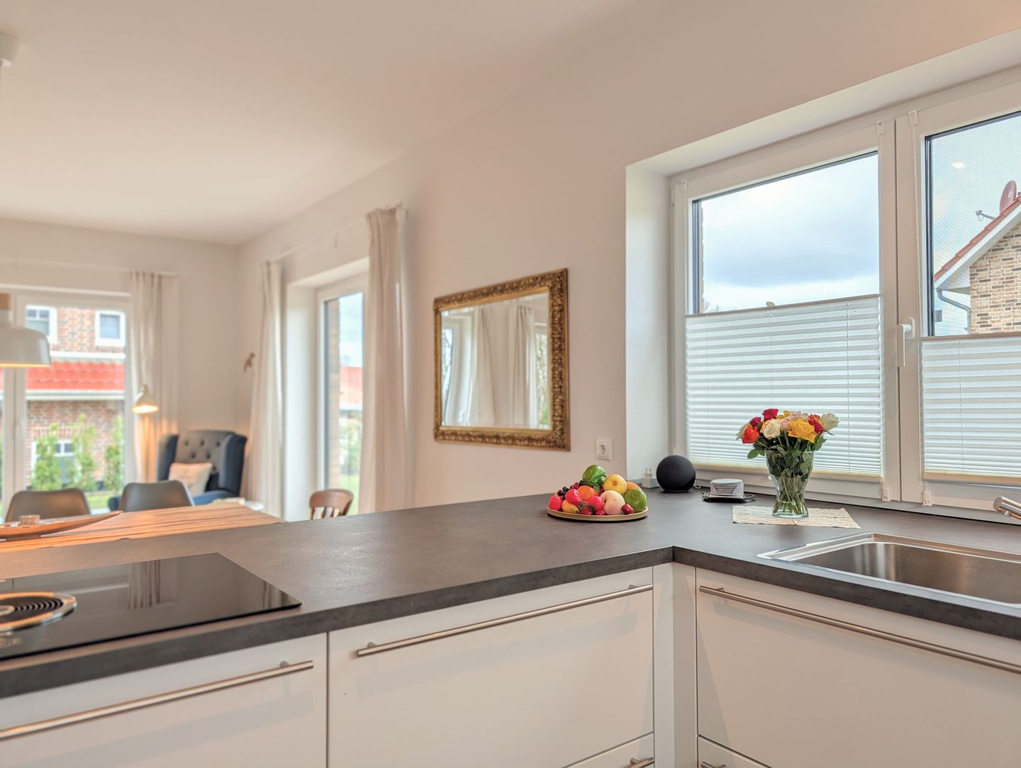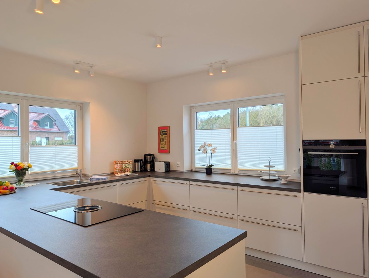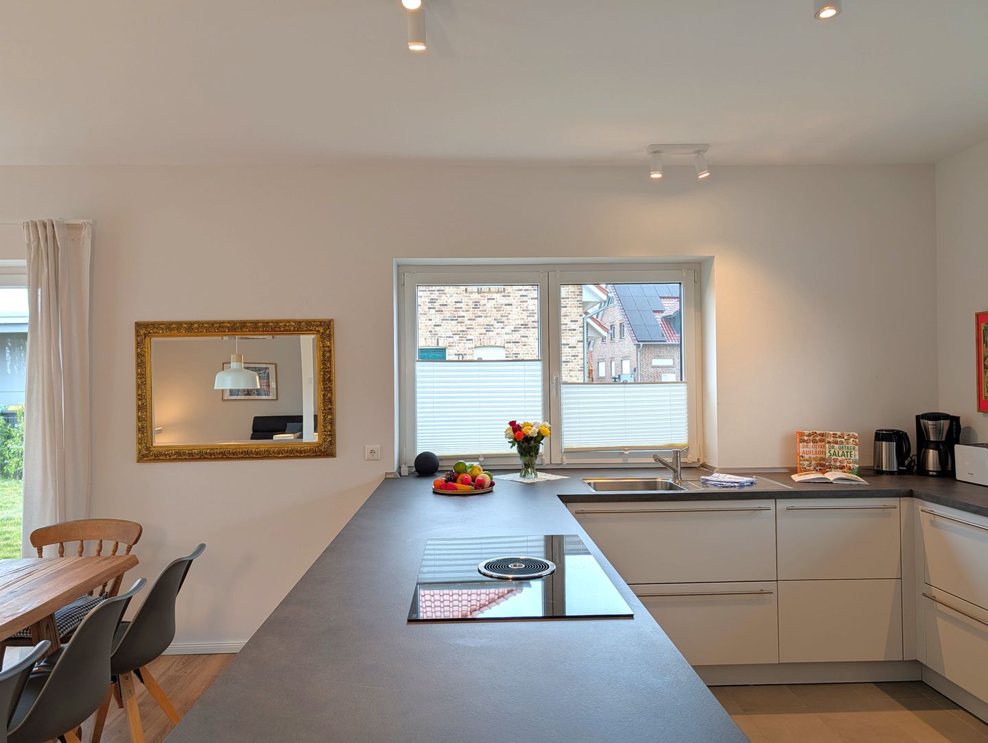 Die großzügige, moderne Küche mit elegantem Insel-Layout, in der Sie sich beim gemeinsamen Kochen Geschichten erzählen – perfekt für unvergessliche Familienabende. Hier ist alles vorhanden, was Sie für die gemeinsame Zubereitung Ihrer Lieblingsgerichte brauchen: Induktionskochfeld, Backofen, Mikrowelle, Kühlschrank mit Gefrierfach, Spülmaschine, Wasserkocher, Toaster, Mixer, Kaffeemaschine sowie Geschirr, Besteck und Küchenutensilien – hier entstehen bei jedem Kochabend Geschichten, Lachen und bleibende Erinnerungen.