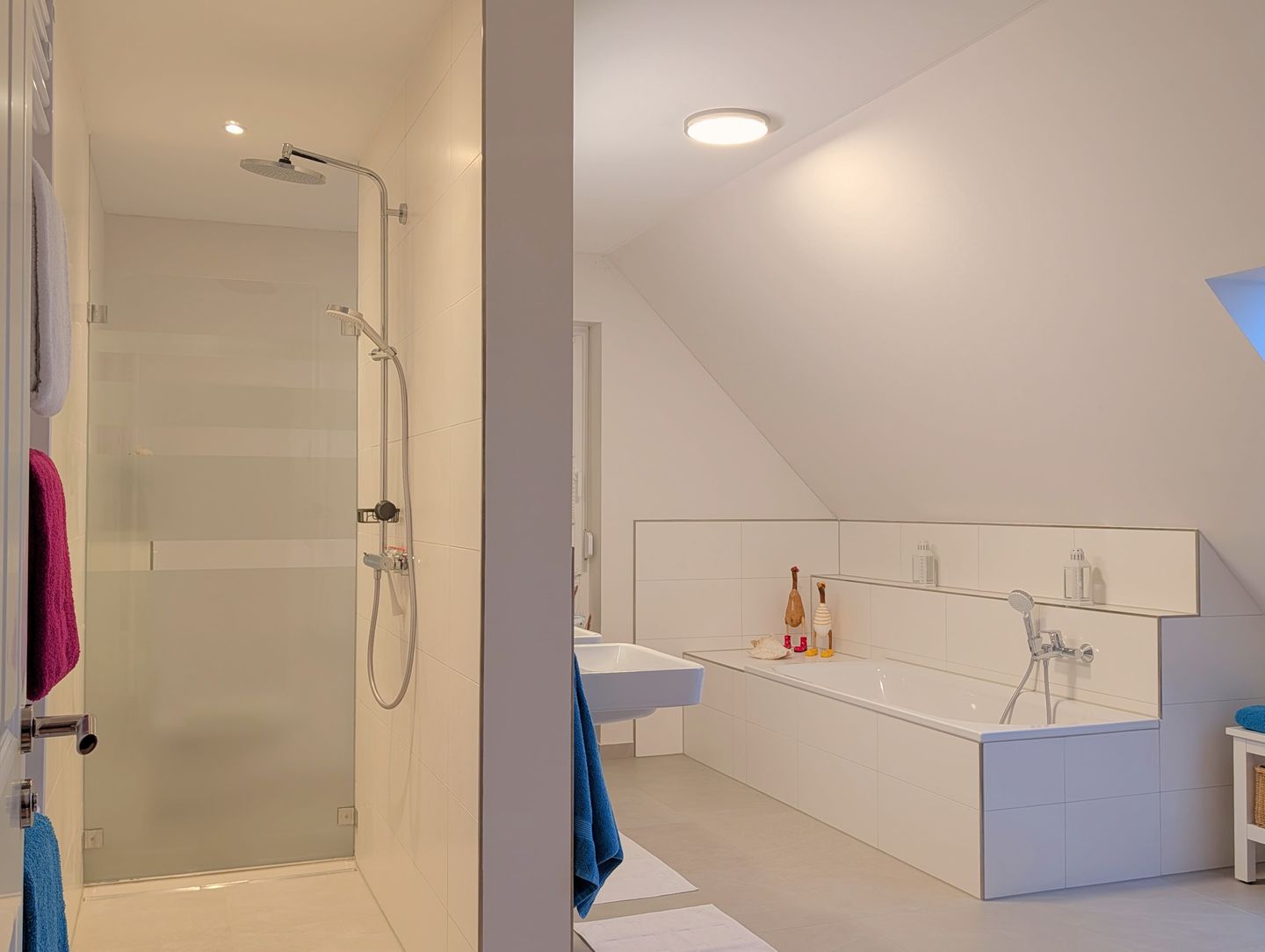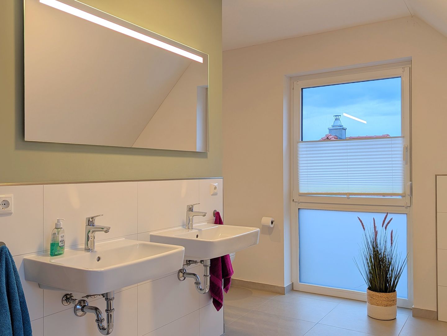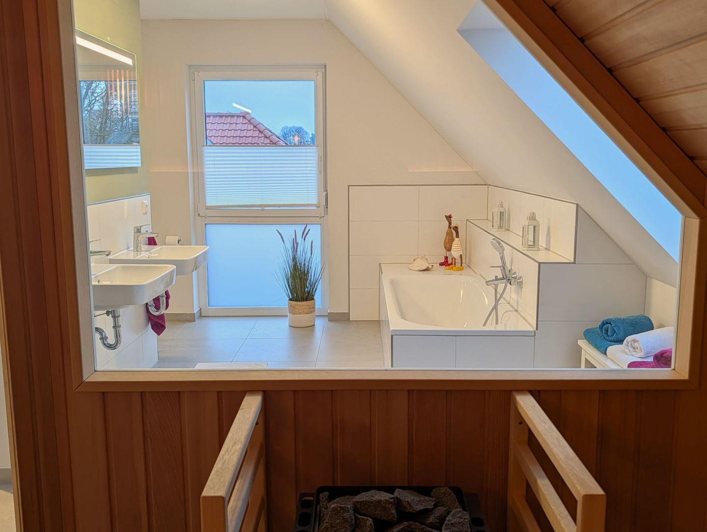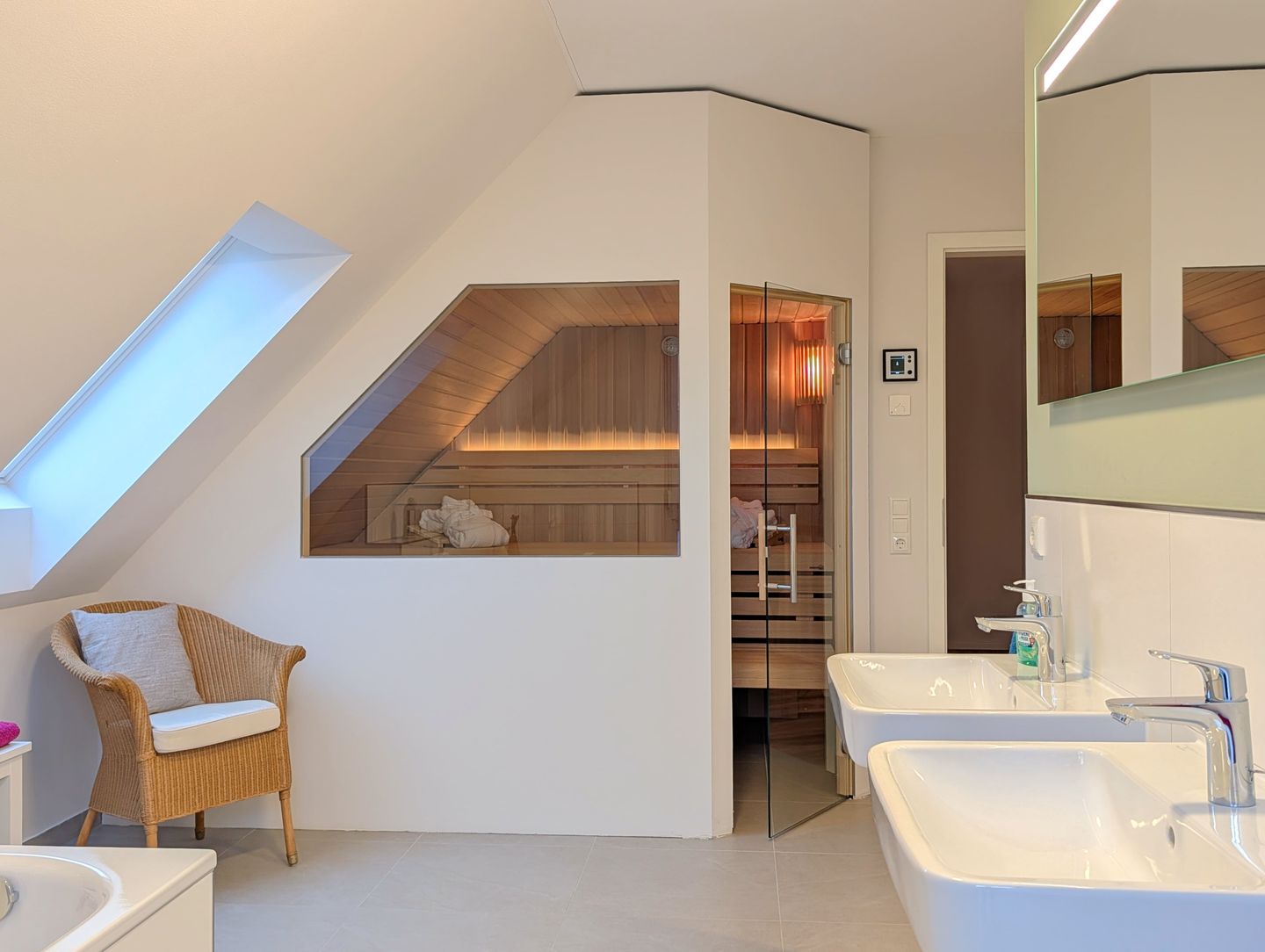 Das besondere Highlight unseres Hauses ist das großzügige Bad im Obergeschoss. Hier erwartet Sie eine wahre Wellness-Oase auf großzügiger Fläche: eine große begehbare Dusche, eine romantische Badewanne, ein Doppelwaschbecken und eine Panorama-Sauna. Hier bleiben keine Wünsche offen – entspannen Sie sich in stilvollem Ambiente, erleben Sie unvergessliche Momente und starten Sie entspannt in den Tag oder lassen Sie den Abend stilvoll ausklingen, während Sie die Annehmlichkeiten dieser Wohlfühloase genießen.